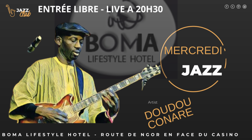 Chers abonnés et followers , Doudou Konaré et sa bande vous donnent rendez-vous 1 mercredi sur 2 de chaque mois au Boma LIfeStyle Hotel (Almadies en face Casino) pour des Lives explosifs comme à l’accoutumée.